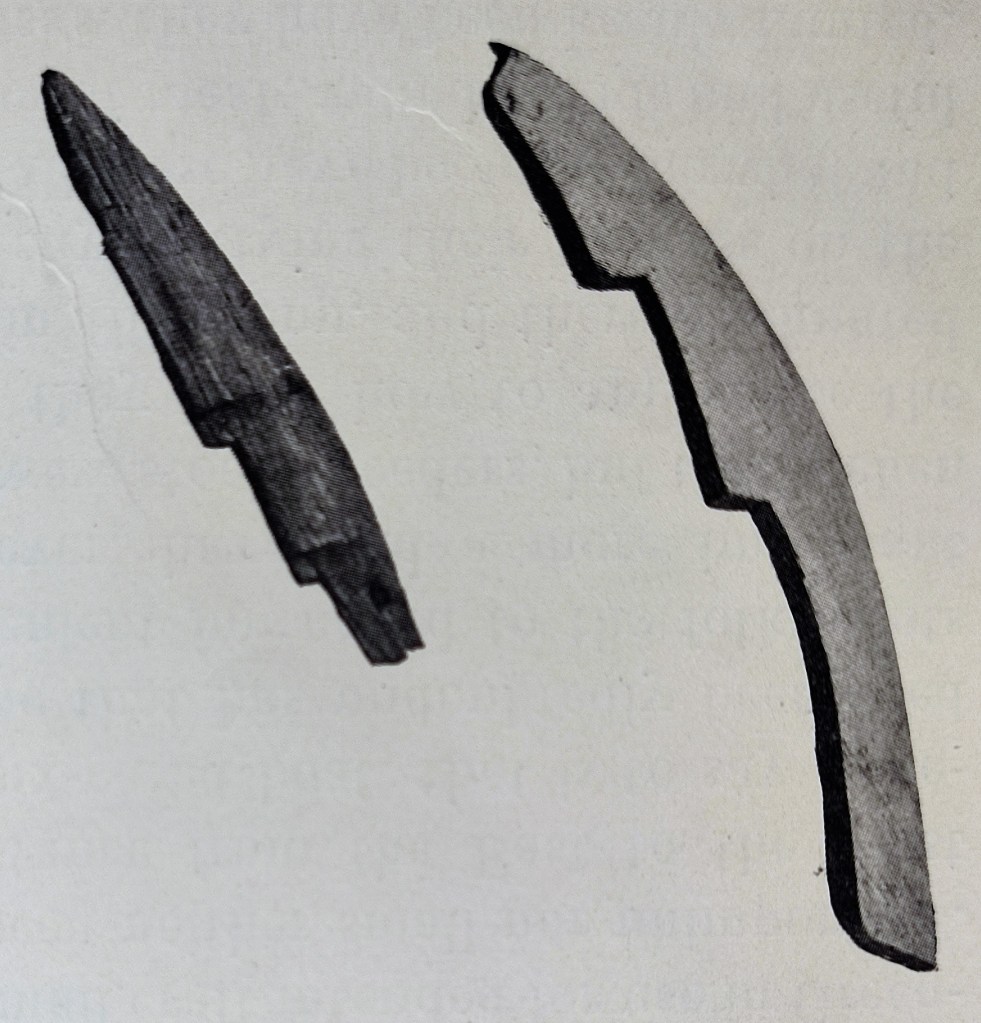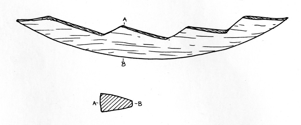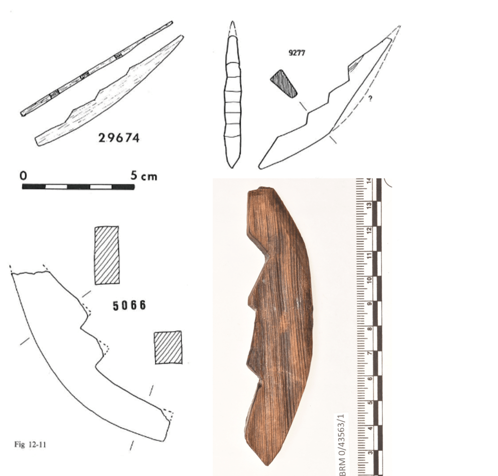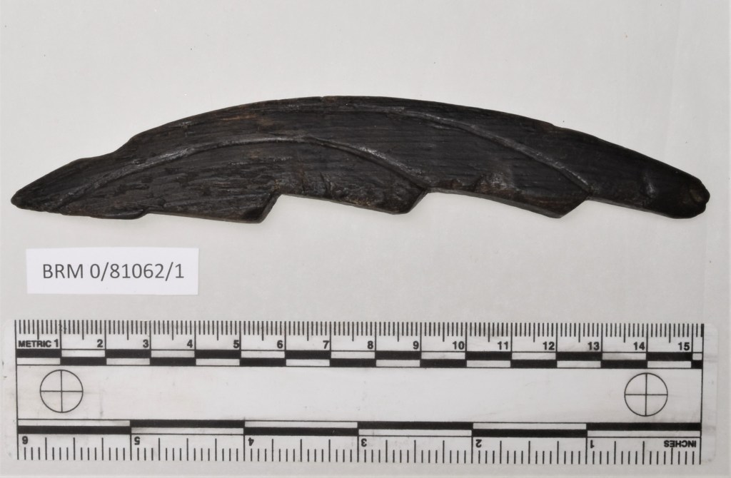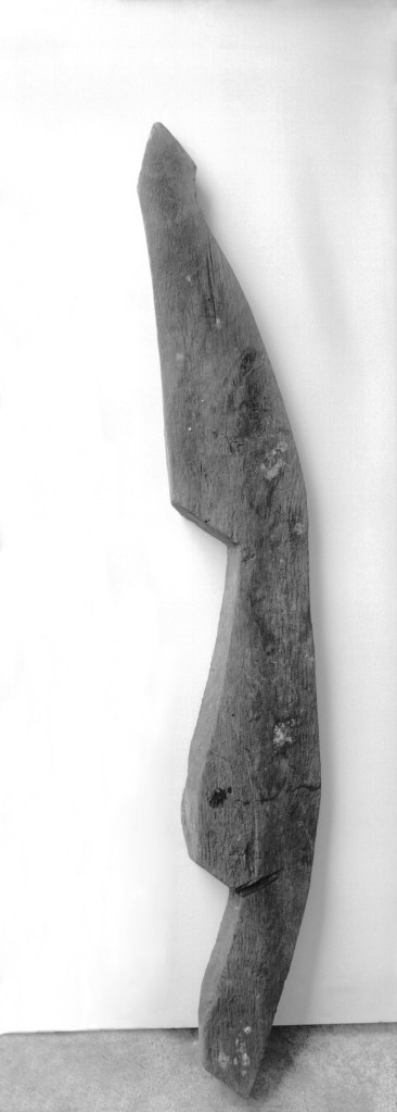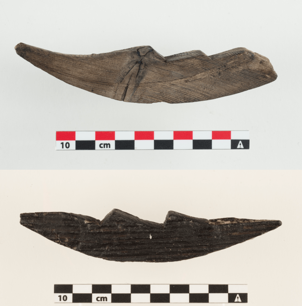 This model is relatively simple and represents a curved stepped stem post, with no decorations or notches from the planking. Again, like the cases above, it shows no indications of being part of a ship or boat model but is still classified as a plaything (Weber 1990, pp. 162-163).