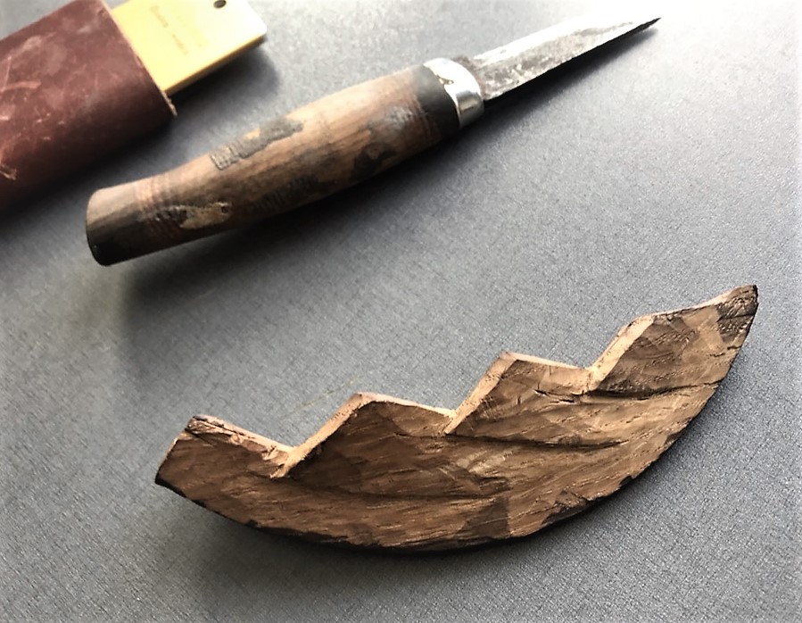 Perhaps a direct observation from a traditional boatyard might be helpful here. Engøyholmen[2] Coastal Culture centre in Stavanger (Norway) runs a wide range of activities related to traditional crafts. Above all, they build and maintain traditional boats. Recently the centre has been tasked to build not a replica but a boat inspired by the Gokstad færing, the smallest boat found in the Gokstad mound from the early Viking Age (Christensen 1959). In any case, they opted to adopt and replicate the stem posts from the original find, which are of the stepped type. Although the boatbuilder in charge has over 25 years of experience, this became a more challenging task than thought due to the complex geometry and lack of previous experience in carving such stem (personal communication). During a visit to Engøyholmen, the topic of miniature stem posts came up, and I proposed that making these miniatures might have helped to familiarise with such a complex shape. Master boatbuilder Hannes Carsten Reuter became intrigued by the idea and began working on a model on his porch the same evening, using a draw knife. A few days later, he reached out to communicate how carving such a model helped not only to familiarise himself with the shape but also how to tackle it with the proper tools. It must be noted, that compared to the stems under study, the model made by this experience boatbuilder shows a higher degree of complexity in form and shaping. This could be easily explained by the fact he is a master practitioner with years of experience in woodworking rather than a novice or peripheral participant.