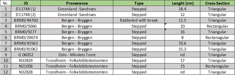 Although the materials from Bergen and Oslo can not be linked to any specific contexts of origin, the models from Trondheim and Greenland seem to be directly connected to domestic life rather than workshops or production sites. Their dimensions vary but remain within the range of an object that can be easily held with one hand. The quality of their craftsmanship is highly variable, from roughly carved-out ones to nicely finished with incised lines. Furthermore, 11 out of 12 models have a triangular cross-section, another realistic feature of full-sized stems, showing that care is given to the three-dimensionality of these objects. None of them has been used in constructing a large model; thus, their creation seems to be an end in itself.